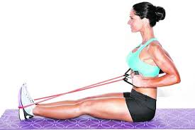 Posición inicial: Siéntate con la espalda recta, las piernas extendidas y la banda elástica alrededor de tus pies. Sujeta los extremos de la banda con las manos, con las palmas una frente a la otra.