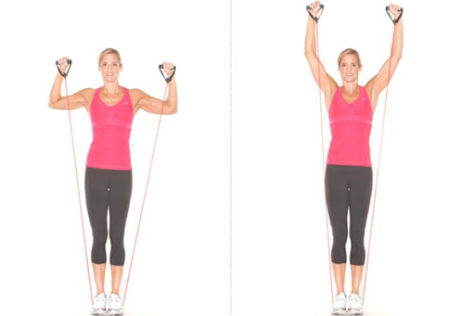 Posición inicial: Pisa el centro de la banda con un pie o ambos. Sujeta los extremos a la altura de los hombros, con las palmas mirando hacia adelante. La espalda debe estar recta y el abdomen contraído.