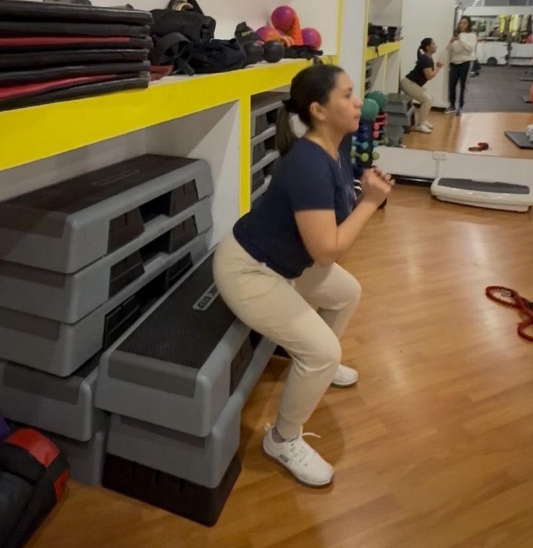 Ejecución: Baja el cuerpo como si te fueras a sentar, manteniendo la espalda recta y el pecho erguido. Toca el banco ligeramente con los glúteos y sube de nuevo con fuerza, sin llegar a sentarte por completo.